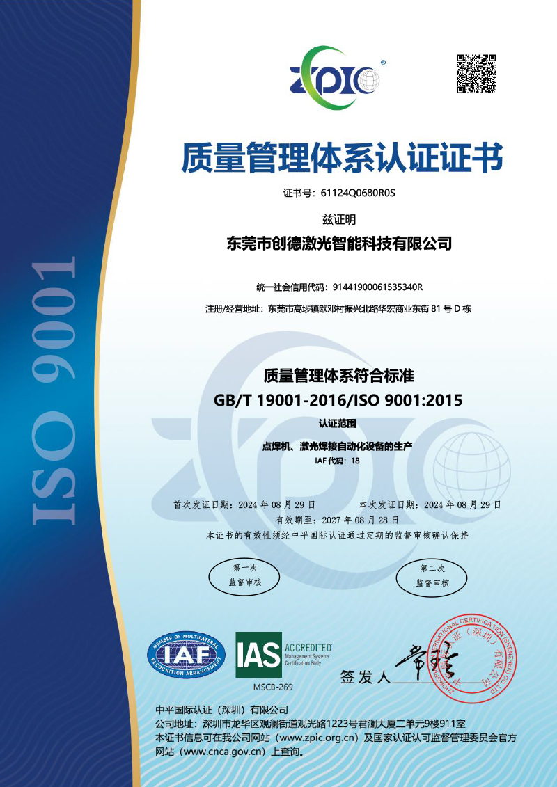 "專業激光精密焊接電阻焊的高新技術企業"東莞市創德激光智能科技有限公司是一家集研發、制造、銷售與技術服務于一體的高新及專精特新企業,專注于新能源鋰電智能裝備制造及電阻焊接和激光焊接解決方案。